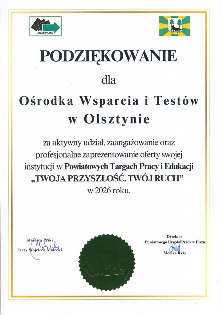 Informujemy, że w dniach 30 oraz 31 grudnia 2025 r. Ośrodek Wsparcia i Testów w Olsztynie będzie przyjmował beneficjentów w godzinach 10:00 – 16:00, natomiast w dniu 5 stycznia 2026 r. w godzinach 11:00 – 17:00.