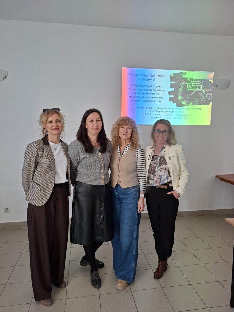 Ośrodek Wsparcia i Testów w Olsztynie nieustannie poszerza współpracę z instytucjami działającymi na rzecz osób z niepełnosprawnościami. 10 października 2025 roku odbyło się spotkanie z przedstawicielkami UniwersyteckiegoCentrum Wsparcia (UCW) – wyspecjalizowanej jednostki Uniwersytetu Warmińsko- Mazurskiego w Olsztynie, która oferuje kompleksowy system wsparcia dla całej społeczności akademickiej. W skład UCW wchodzą dwie kluczowe jednostki: Ośrodek Pomocy Psychologicznej i Psychoedukacji „Empatia” oraz Biuro ds. Osób z Niepełnosprawnościami (BON). W spotkaniu uczestniczyły: Marzena Radzka-Wiśniewska – Kierowniczka Uniwersyteckiego Centrum Wsparcia, Koordynatorka Ośrodka Pomocy Psychologicznej i Psychoedukacji UWM „Empatia”, pedagog, trenerka Polskiego Towarzystwa Psychologicznego, coach, Design Manager, Dorota Filip – Specjalistka ds. Osób z Niepełnosprawnościami w Biurze ds. Osób z Niepełnosprawnościami Uniwersytetu Warmińsko-Mazurskiego w Olsztynie, odpowiedzialna za wspieranie studentów i pracowników ze szczególnymi potrzebami w tym z niepełnosprawnościami, szkolenia podnoszące świadomość na temat dostępności oraz zajęcia dedykowane i wyrównawcze, Dorota Opolska – Specjalistka ds. Osób z Niepełnosprawnościami w Biurze ds. Osób z Niepełnosprawnościami Uniwersytetu Warmińsko-Mazurskiego w Olsztynie, odpowiedzialna za wspieranie studentów i pracowników ze szczególnymi potrzebami w tym z niepełnosprawnościami oraz organizację usług asystenckich i transport. Spotkanie prowadziły: Wanda Agnieszka Jabłońska i Sylwia Przybylińska. Rozmowa była okazją do wymiany doświadczeń i omówienia realnych potrzeb studentów z niepełnosprawnościami, którzy mogliby skorzystać z usług i technologii oferowanych przez OWiT. Przedstawicielki UCW z dużym zainteresowaniem zapoznały się z możliwościami testowania i wypożyczania sprzętu dostępnego w Ośrodku, szczególnie z takiego, który może ułatwić studentom codzienne funkcjonowanie oraz naukę. Dopytywały o szczegóły dotyczące sposobu wypożyczenia i procedury korzystania z wypożyczalni technologii wspomagających. Podczas spotkania podkreślono, że OWiT i Uniwersyteckie Centrum Wsparcia mają wiele wspólnych obszarów działania – łączy je misja wyrównywania szans, wspierania samodzielności i budowania środowiska dostępnego dla wszystkich. Spotkanie zakończyło się wspólnym przekonaniem, że połączenie potencjału OWiT i Uniwersyteckiego Centrum Wsparcia może realnie wzmocnić system pomocy dla osób z niepełnosprawnościami w środowisku akademickim. To kolejny krok w kierunku budowania sieci współpracy na rzecz dostępności, równości i samodzielności.